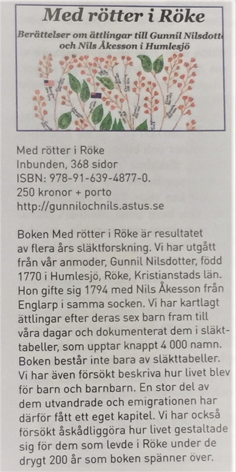 Boken Med rötter i Röke är resultatet av flera års släktforskning. Vi har utgått från vår anmoder Gunnil Nilsdotter född 1770 i Humlesjö, Röke. Hon gifte sig 1794 med Nils Åkesson från Englarp i samma socken. Vi har kartlagt ättlingarna till deras sex barn fram till våra dagar och dokumenterat dem i släkttabeller, som upptar knappt 4000 namn.