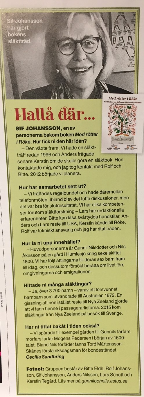 Sif Johansson berättade om boken i spalten "Hallå där..." i Släkthistoria No 3, 2020